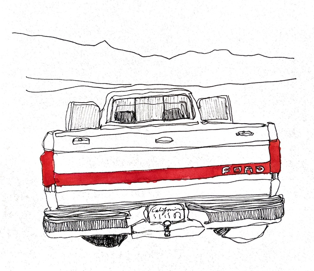 A 1988 Ford F-150, square-bodied white and rustless. Perfectly preserved by the high mountain air.